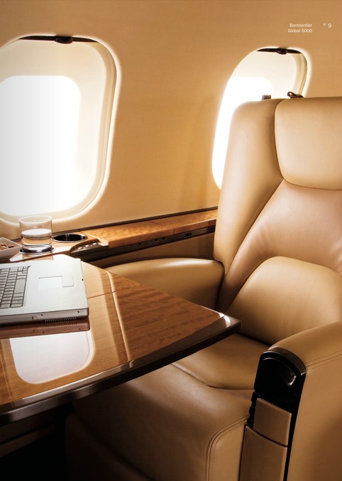 Interior Highlights 客艙要點 The sophisticated cabin of the Bombardier Global 5000 aircraft (龐巴迪環(huán)球5000公務(wù)機) provides passengers with more high-comfort living and working area than any other super-large business jet. Its quiet, airy atmosphere is highly conducive to relaxed productivity. Equipped with one of the world's most advanced, most reliable Cabin Electronic Systems, the aircraft offers business travelers the same high-caliber, high-speed connectivity capabilities and office options they enjoy on the ground, plus on-demand news/weather/sports packages as well as a theatre of entertainment choices.
