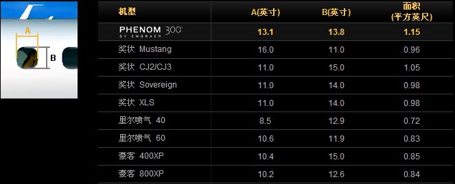 飛鴻300公務機最佳價值 1 - 按照2008年5月出版的公務/商用飛機采購手冊的說明,所有飛機的航程均是在攜帶了符合NBAA IFR 規(guī)定的飛往100海里備降場的備份燃油量,并且搭載4位乘客每位重200磅的基礎上給出的。 2 - 國際標準大氣、最大起飛重量、海平面。 3 - 所有競爭對手產品的價格均在2007/2008年度公務/商用飛機采購手冊數據的基礎上給出。飛鴻300飛機2008年1月的價格等同于2005年1月685萬美元的價格。 窗戶尺寸對比 飛鴻300公務機窗戶尺寸對比 |