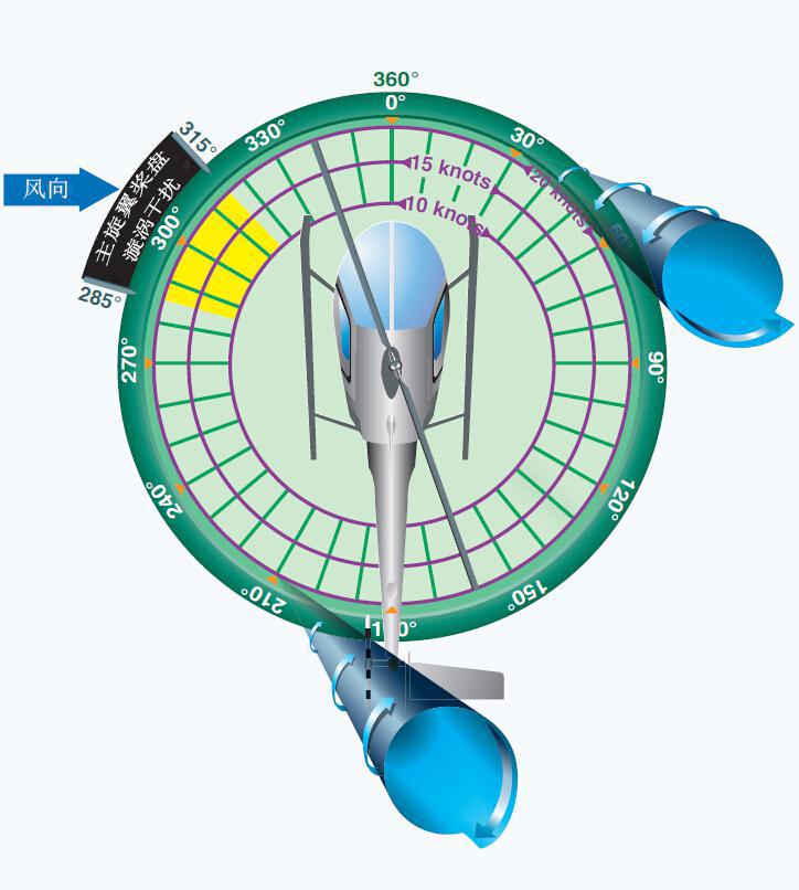 b)導(dǎo)致直升機(jī)喪失尾槳效應(yīng)(LTE)的原因直升機(jī)制造商進(jìn)行了大量的飛行測試和風(fēng)洞試驗(yàn),通過這些測試確定了三個相對風(fēng)方位區(qū)域,以及由此產(chǎn)生的直升機(jī)特性,它們可能單獨(dú)或組合性地形成一種喪失尾槳效應(yīng)(LTE)誘導(dǎo)環(huán)境,這種環(huán)境會對直升機(jī)的控制構(gòu)成負(fù)面影響。這些測試的一個直接結(jié)果是,低速飛行狀態(tài)下的飛行運(yùn)行會極大提高飛行員的工作負(fù)荷。盡管每個區(qū)域都確定了特定的風(fēng)方位,但飛行員應(yīng)了解,方位的變化取決于周圍環(huán)境條件,這些區(qū)域會相互重疊,在這些重疊區(qū)域,會發(fā)生最顯著的推力變化。這些特性僅在空速低于 30 節(jié)時出現(xiàn),且適用于所有單旋翼帶尾槳直升機(jī),飛行測試數(shù)據(jù)證實(shí),在此過程中尾槳并未失速。