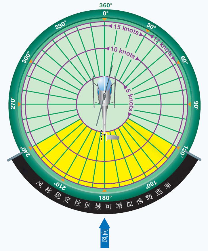 在這個區(qū)域直升機(jī)會試圖將機(jī)頭朝向相對風(fēng),除非使用腳蹬修正偏轉(zhuǎn),否則直升機(jī)會緩慢的非指令右轉(zhuǎn)或左轉(zhuǎn), 具體轉(zhuǎn)彎方向取決于風(fēng)向,如果駕駛員允許直升機(jī)形成右偏速率,直升機(jī)尾部進(jìn)入這個區(qū)域,轉(zhuǎn)彎角速度會迅速增大, 可能會導(dǎo)致喪失尾槳效應(yīng)。為避免順風(fēng)條件下出現(xiàn)喪失尾槳效應(yīng),駕駛員應(yīng)集中注意力操縱直升機(jī),保持對轉(zhuǎn)彎速率的主動及時控制。