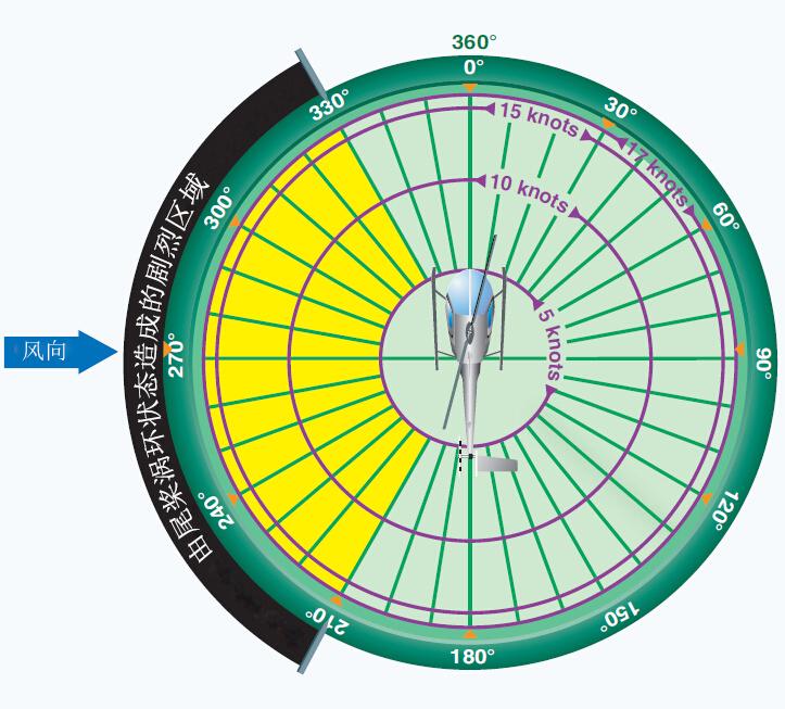 生,如果不加以修正,會發(fā)展成為不可控制的繞軸快速旋轉(zhuǎn), 最終導(dǎo)致尾槳失去效應(yīng)。在該區(qū)域內(nèi)運(yùn)行時,飛行員必須了解尾槳推力可能突然減小,做好準(zhǔn)備迅速反應(yīng),使用額外的左腳蹬量抵消這種減小。