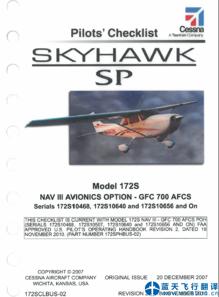 北京藍(lán)天飛行翻譯公司承接大型通航公司的塞斯納172S飛行員檢查單翻譯任務(wù) Cessna 172S Pilots' Checklist Translation