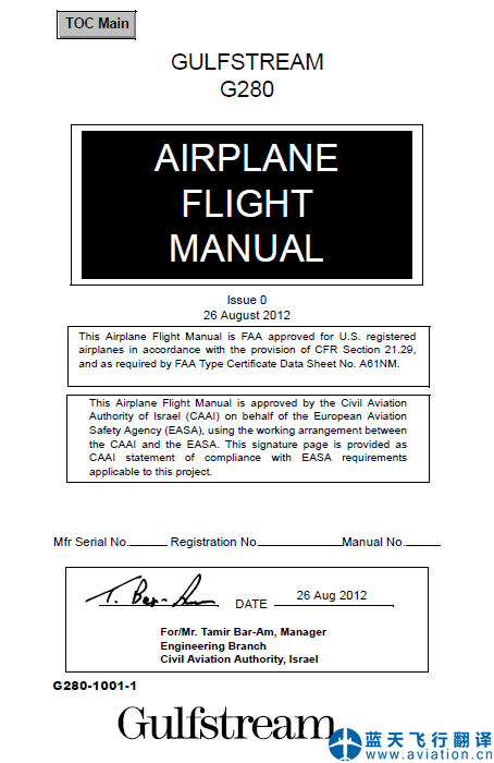 藍(lán)天飛行翻譯公司承接金鹿公務(wù)機(jī)灣流G280全套飛行手冊(cè)翻譯任務(wù) Gulfstream G280 Flight Manual Translation ![]() 灣流G280飛機(jī)飛行手冊(cè) G280 Airplane Flight Manual ![]() 灣流G280飛機(jī)操作手冊(cè) G280 Aircraft Operating Manual 本次灣流G280公務(wù)機(jī)翻譯任務(wù)主要有灣流G280飛機(jī)飛行手冊(cè)(G280 Airplane Flight Manual)、灣流G280飛機(jī)操作手冊(cè)(G280 Aircraft Operating Manual)、灣流G280快速檢查單(G280 Quick Reference Handbook)等。 有關(guān)灣流G280公務(wù)機(jī)介紹:
