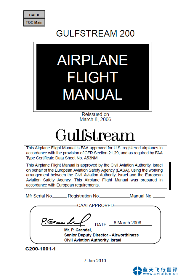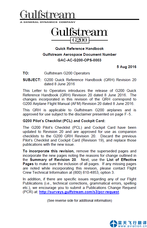 藍(lán)天飛行翻譯公司完成公務(wù)機(jī)公司的灣流G200飛機(jī)飛行手冊(cè)和快速檢查單翻譯任務(wù) GULFSTREAM 200 AIRPLANE FLIGHT MANUAL and Quick Reference Handbook Translation ![]() 灣流G200飛機(jī)飛行手冊(cè) GULFSTREAM 200 AIRPLANE FLIGHT MANUAL ![]() 灣流G200快速檢查單 GULFSTREAM 200 Quick Reference Handbook 灣流G200飛機(jī)飛行手冊(cè)(GULFSTREAM 200 AIRPLANE FLIGHT MANUAL)的主要內(nèi)容包含有: G200 AFM Introduction Copyright & License INTRODUCTION GENERAL REVISIONS SUPPLEMENTS DEFINITIONS LIMITATIONS EMERGENCY PROCEDURES ABNORMAL PROCEDURES NORMAL PROCEDURES SUPPLEMENTS COMPATIBILITY LOG OF MODIFICATIONS LOG OF REVISIONS LOG OF TEMPORARY REVISIONS LOG OF EFFECTIVE PAGES Limitations LIST OF FIGURES CERTIFICATE LIMITATIONS KINDS OF OPERATIONS REDUCED VERTICAL SEPARATION MINIMUMS (RVSM) MINIMUM FLIGHT CREW WEIGHT LIMITATIONS MAXIMUM CERTIFICATED WEIGHTS (LB/KG) MINIMUM FLIGHT WEIGHT (LB/KG) BAGGAGE COMPARTMENT WEIGHT AND LOADING CENTER-OF-GRAVITY LIMITATIONS Center-of-Gravity Envelope POWERPLANT LIMITATIONS APPROVED OILS APPROVED FUELS FUEL SYSTEM LIMITATIONS FUEL TANKS CAPACITY FUEL TANK TEMPERATURE LIMITATIONS (indicated) FUEL UNBALANCE MINIMUM FUEL FOR GO-AROUND Maximum Fuel Tank Temperature Vs. Altitude ENGINE OPERATING LIMITATIONS MAXIMUM RPM, N1 AND N2 MAXIMUM INTERSTAGE TURBINE TEMPERATURE TIME LIMITS OIL PRESSURE (At Normal Operating Temperature) OIL TEMPERATURE AMBIENT TEMPERATURE AND ALTITUDE ENVELOPE APU LIMITATIONS APU Load Limits without Mod 10163 SPEED LIMITATIONS MAXIMUM OPERATION LIMIT SPEED (VMO/MMO) MANEUVERING SPEED (VA) Speed Limitations MAXIMUM SLATS/KRUEGER/FLAPS EXTENSION (VSE/VFE) MAXIMUM LANDING GEAR EXTENSION (VLO/VLE) MAXIMUM LANDING GEAR EXTENDED ALTITUDE MAXIMUM TIRE GROUND SPEED MINIMUM CONTROL SPEED - AIR (VMCA) MINIMUM CONTROL SPEED - GROUND (VMCG) MAXIMUM AIR BRAKES OPERATION/ EXTENDED SPEED MINIMUM FLIGHT SPEED MAXIMUM WINDSHIELD WIPER OPERATING SPEED (PRE-MOD 10141) PROHIBITED MANEUVERS LOAD FACTOR LIMITS MAXIMUM APPROVED OPERATING ALTITUDE OPERATING TEMPERATURE/ALTITUDE LIMITATIONS OPERATING TEMPERATURE/ALTITUDE LIMITATIONS RUNWAY SLOPE LIMITATIONS (TAKE-OFF ONLY) MAXIMUM TAILWIND COMPONENTS APPROVED RUNWAY SURFACE TYPE HYDRAULIC SYSTEM LIMITATIONS APPROVED HYDRAULIC FLUIDS HYDRAULIC PRESSURE LIMITATIONS HYDRAULIC TEMPERATURE LIMITATIONS THRUST REVERSERS CABIN PRESSURIZATION MAXIMUM CABIN DIFFERENTIAL PRESSURE ANTI-ICE SYSTEM LIMITATIONS GROUND OPERATIONS DE-ICE SYSTEM LIMITATIONS ELECTRICAL SYSTEM LIMITATIONS DC STARTER - GENERATOR LIMITS BATTERY LIMITS HORIZONTAL STABILIZER TRIM OPERATING LIMITATIONS AUTOPILOT LIMITATIONS Yaw Damper ENHANCED SURVEILLANCE FLIGHT IDENTIFICATION (WITH MOD 10154) INSTRUMENT MARKINGS PLACARDS (Pre MOD 03842) PLACARDS (Post MOD 03842) Emergency Procedures LIST OF FIGURES EICAS WARNING MESSAGES EICAS Display - Primary Page GENERAL GUIDANCE Warning Messages ENGINE FIRE OR ENGINE OVER HEAT |