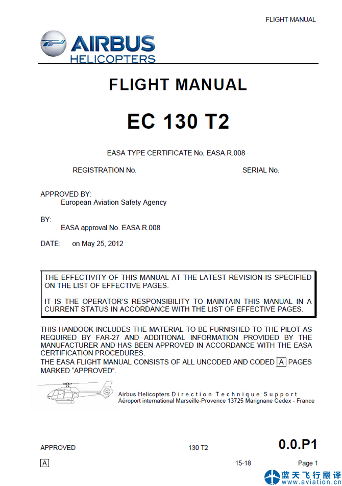 藍天飛行翻譯公司完成通用航空公司的空客EC130 T2飛行手冊翻譯任務(wù) AIRBUS HELICOPTERS EC 130 T2 FLIGHT MANUAL Translation