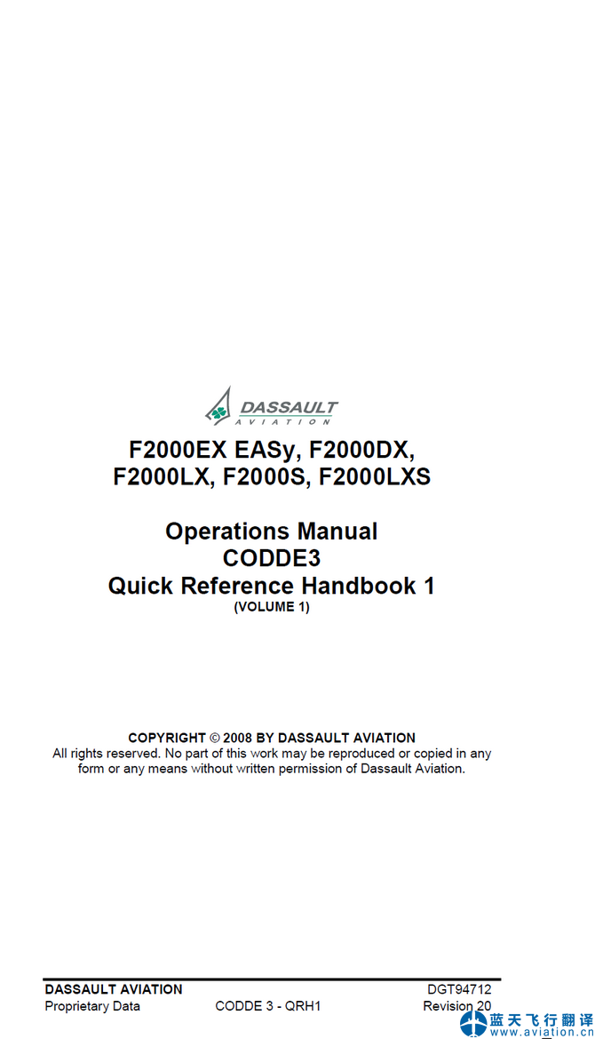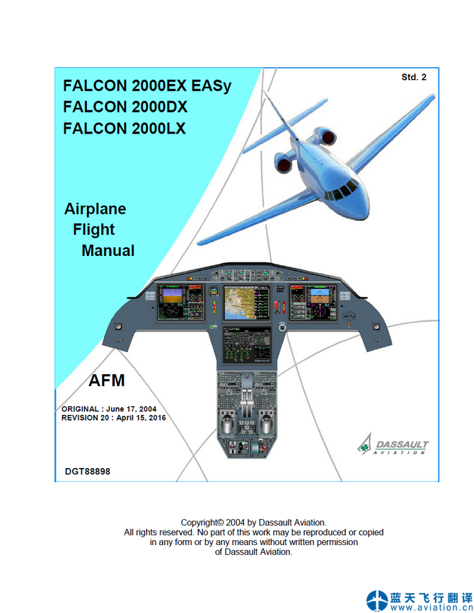 北京藍(lán)天飛行翻譯公司完成2016年4月15日版本達(dá)索獵鷹FALCON 2000飛行手冊(cè)翻譯 FALCON 2000 Flight Manual Translation CODDE(Crew Operational Documentation for Dassault EASy) REVISION 18 : April 15, 2016,機(jī)組使用手冊(cè)為第18版,2016年4月15日版本 QRH(Quick Reference Handbook) Revision 20 快速檢查單為第20版 AFM(Airplane Flight Manual) REVISION 20 : April 15, 2016 飛機(jī)飛行手冊(cè)為第20版,2016年4月15日版本 ![]() FALCON 2000 CODDE(Crew Operational Documentation for Dassault EASy) 達(dá)索獵鷹2000機(jī)組使用手冊(cè) ![]() FALCON 2000 AFM(Airplane Flight Manual) 達(dá)索獵鷹2000飛機(jī)飛行手冊(cè)
