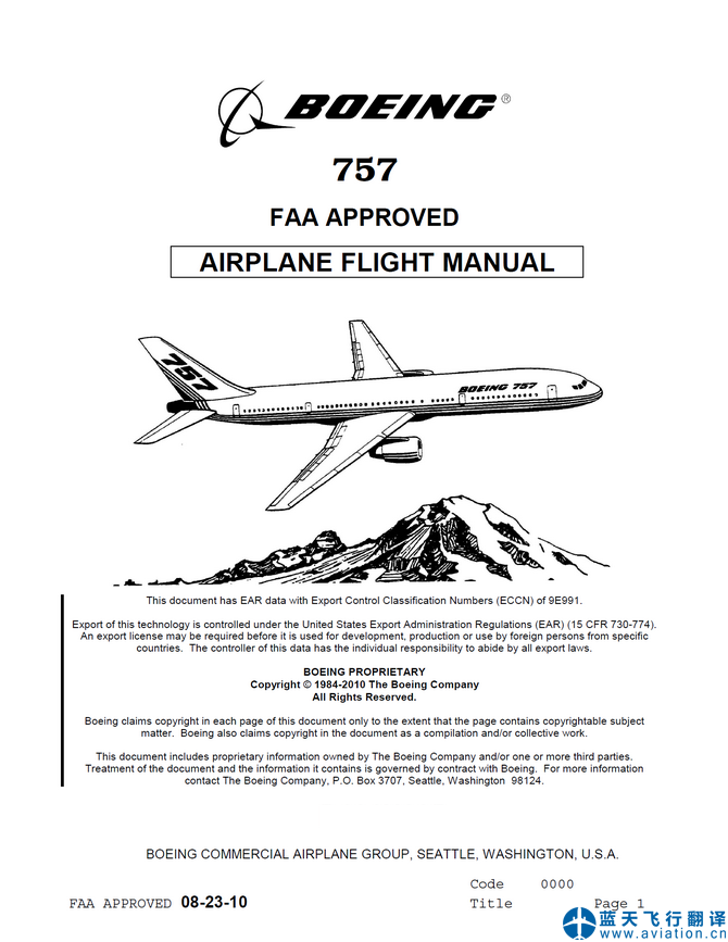 北京藍天飛行翻譯公司完成航空公司波音757飛機飛行手冊翻譯任務(wù) Boeing 757 Airplane Flight Manual Translation