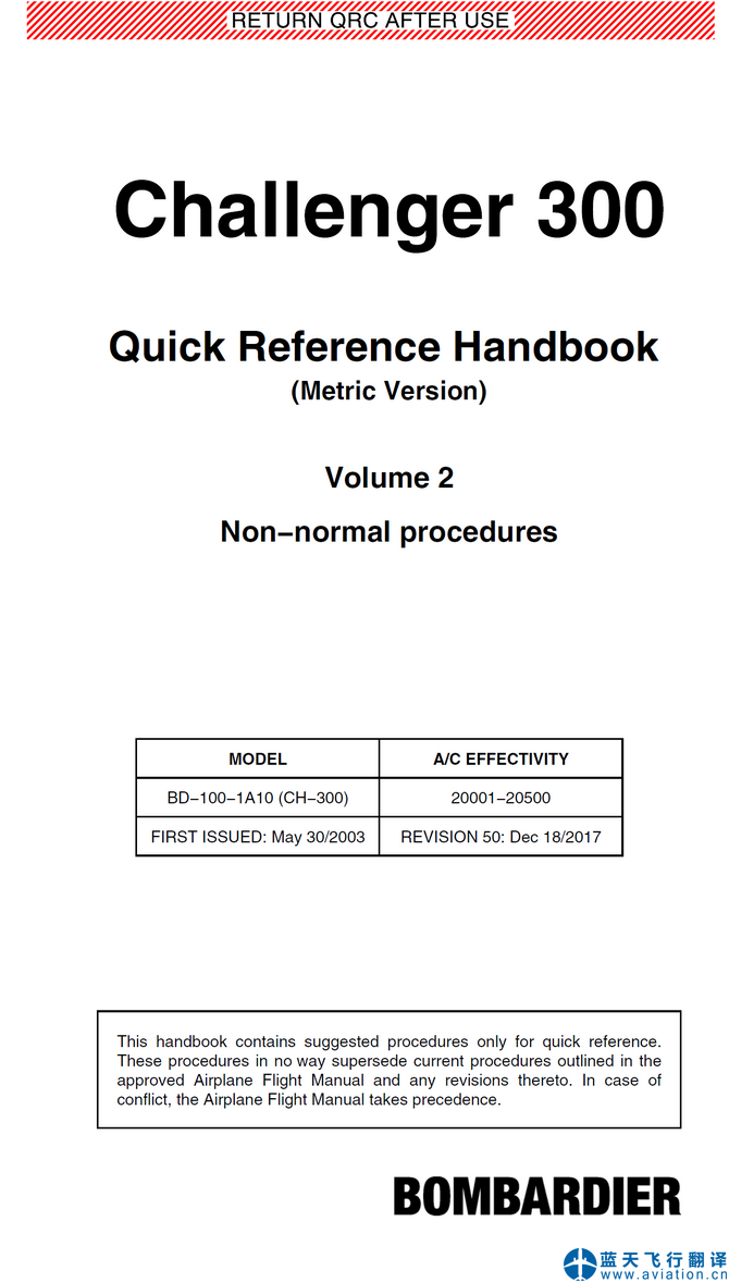 北京藍天飛行翻譯公司完成大型公務機公司2017年12月18日版本龐巴迪挑戰(zhàn)者300公務機快速檢查單翻譯任務 Rev 50, Dec 18/2017 Bombardier Challenger 300 Quick Reference Handbook Translation