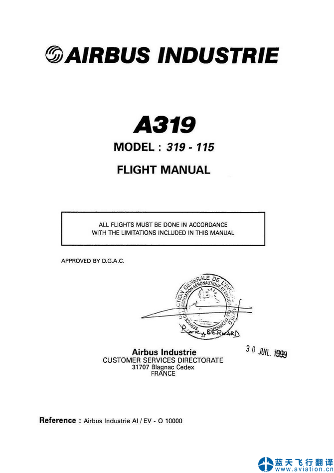 北京藍(lán)天飛行翻譯公司完成大型公務(wù)機(jī)公司2018年8月6日版本空客公務(wù)機(jī)ACJ319全套飛行手冊(cè)翻譯任務(wù) 06 AUG 18 whole set of ACJ319 Flight Manual Translation