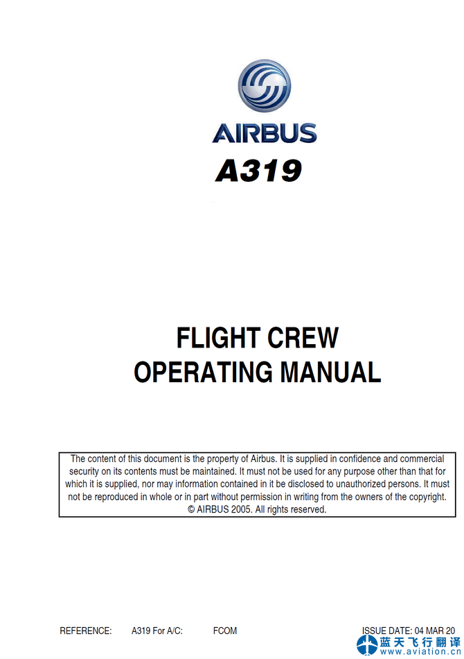 本次翻譯的ACJ319構(gòu)型為319-115,ACJ319飛行機(jī)組操作手冊(cè)和ACJ319快速檢查單修訂日期為2020年3月4日,ACJ319飛機(jī)飛行手冊(cè)修訂日期為2020年3月10日。