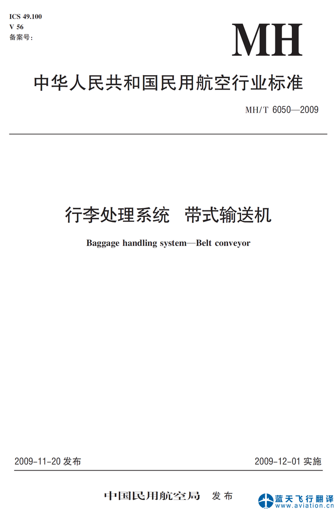 北京藍(lán)天飛行翻譯有限公司承接中華人民共和國民用航空行業(yè)標(biāo)準(zhǔn)行李處理系統(tǒng)帶式輸送機(jī)翻譯任務(wù) MH/T 6050—2009 行李處理系統(tǒng)帶式輸送機(jī) Baggage Handling System—Belt Conveyor, Civil Aviation Industrial Standard Translation