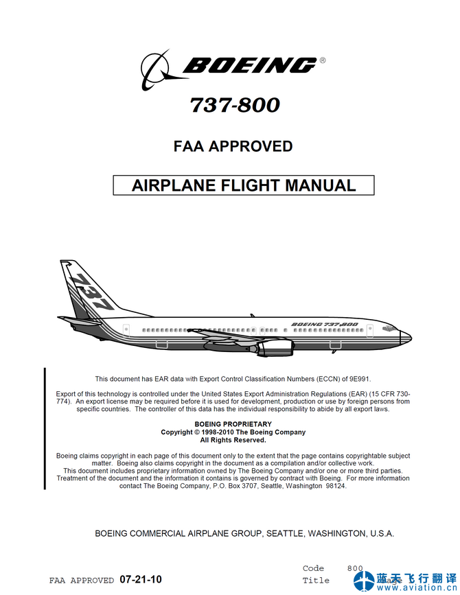 北京藍(lán)天飛行翻譯公司本次翻譯的波音737-800飛機(jī)飛行手冊(Airplane Flight Manual)版本日期為2020年1月17日,適用于航空公司的24架737-800機(jī)型飛機(jī)。