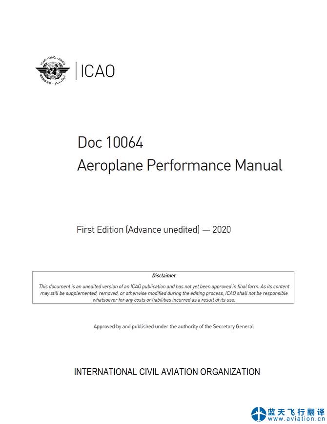 北京藍(lán)天飛行翻譯公司承接國(guó)際民航組織飛機(jī)性能手冊(cè)翻譯任務(wù) INTERNATIONAL CIVIL AVIATION ORGANIZATION, Aeroplane Performance Manual Translation