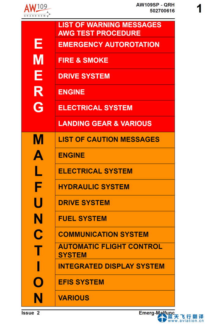 AW109直升機(jī)快速檢查單(Quick Reference Handbook(QRH))的主要內(nèi)容包含有: