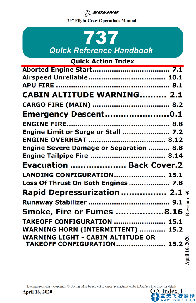 北京藍天飛行翻譯公司本次翻譯的737-800飛行機組使用手冊、快速檢查單和飛機飛行手冊修訂日期為2020年4月16日,總共包含62架飛機。