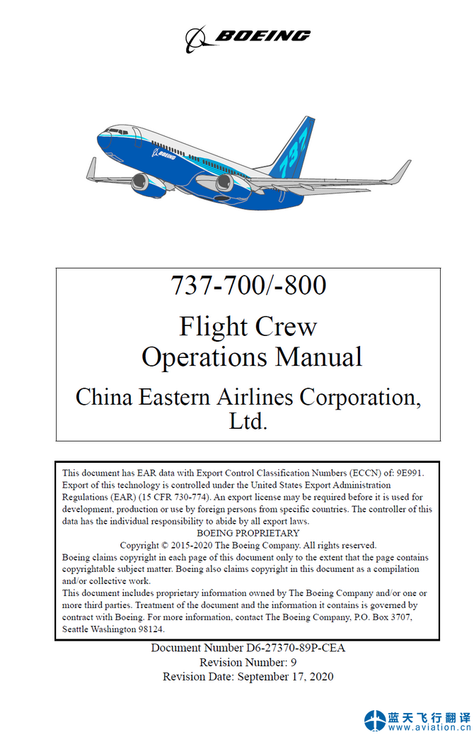 北京藍天飛行翻譯有限公司完成大型航空公司的2020年9月17日版本波音737-700/-800飛行機組使用手冊(Flight CrewOperations Manual FCOM)和快速檢查單(Quick Reference Handbook QRH)翻譯任務(wù) 737-700/-800 Flight CrewOperations Manual and Quick Reference Handbook Translation
