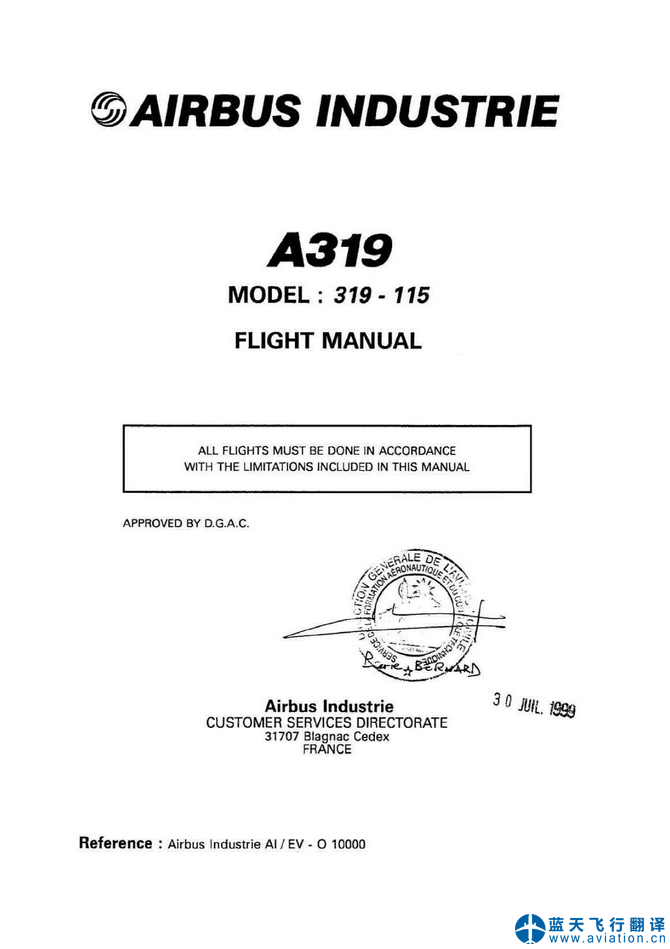 北京藍(lán)天飛行翻譯公司本次翻譯的ACJ319構(gòu)型為319-115,ACJ319飛行機(jī)組操作手冊和ACJ319快速檢查單修訂日期為2020年11月30日,ACJ319飛機(jī)飛行手冊修訂日期為2020年12月8日。