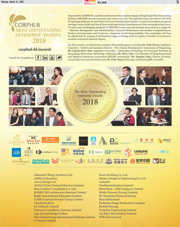 香港《星島日?qǐng)?bào)》在2018年3月19日刊載2018年度杰出企業(yè)得獎(jiǎng)名單