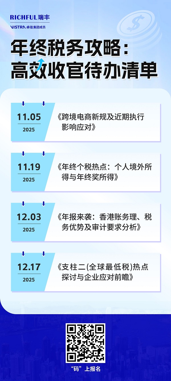 歲末將至,面對紛繁復雜的稅務政策與緊迫的年度收官工作,您是否正在尋求一份清晰高效的行動指南?我們精心策劃 “年終稅務攻略:高效收官待辦清單”系列網絡研討會,直擊四大關鍵議題,助您系統梳理合規路徑,優化財稅布局,為2025年的穩健發展奠定堅實基礎。