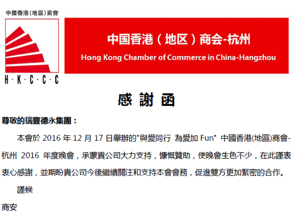 12月22日,瑞豐德永收到了一封來至于中國香港(地區(qū))商會-杭州的感謝信,在此也對中國香港(地區(qū))商會-杭州對瑞豐德永的支持與信任表示衷心的感謝。未來雙方將繼續(xù)攜手為內地企業(yè)和個人“走出去”提供更全面專業(yè)的服務,為助力中港聯動發(fā)揮更大的作用。