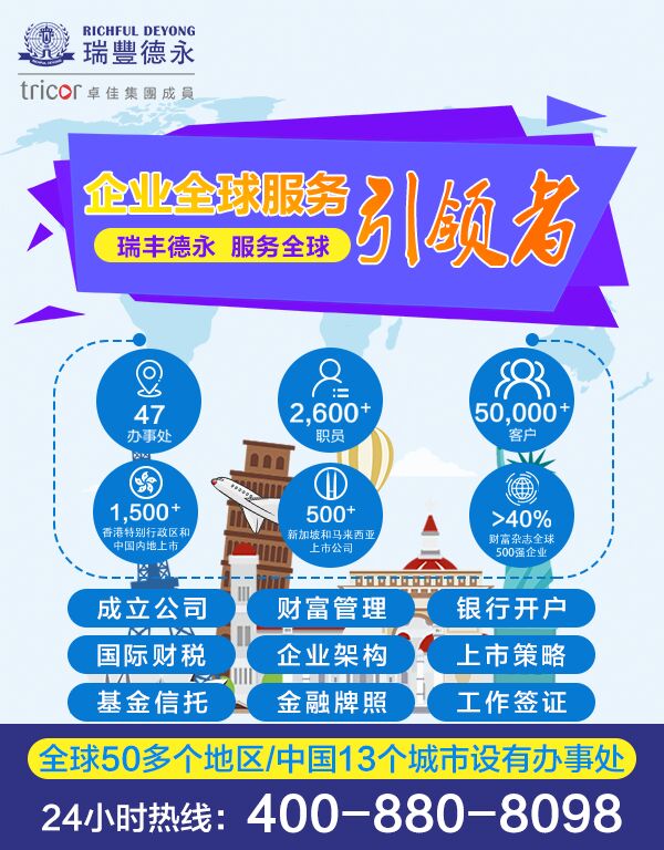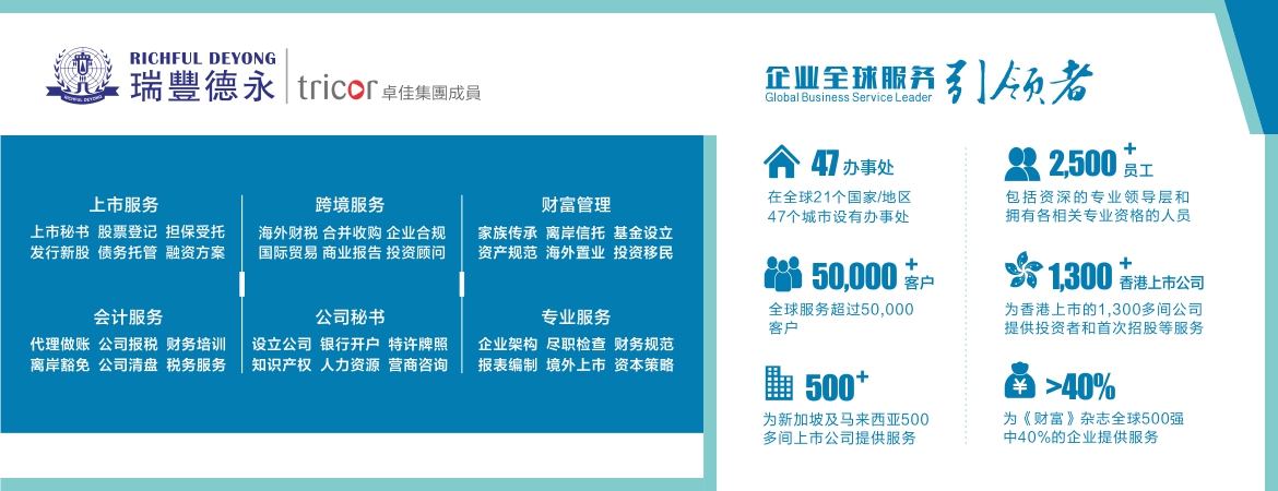 瑞豐德永(Richful Deyong)2008年始創(chuàng)于香港,系卓佳(Tricor)集團(tuán)成員,是亞洲具有領(lǐng)先地位的專業(yè)服務(wù)機(jī)構(gòu),在全球21個(gè)國家/地區(qū)47個(gè)城市設(shè)有辦事處,擁有2500多名員工,服務(wù)超過30000客戶,1300間香港聯(lián)交所上市公司,500間新加坡和馬來西亞上市公司,名列財(cái)富雜志500強(qiáng)企業(yè)超40%及眾多跨國知名公司。