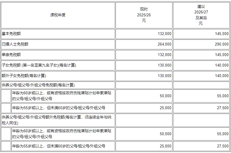 在2026-27年度財政預算案中,財政司司長建議以下措施:一次性寬減二○二五/二六課稅年度稅款;免稅額的調整;長者住宿照…