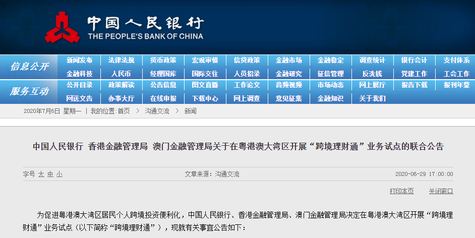 6月29日,市場(chǎng)翹首等待已久的“跨境理財(cái)通”終于出爐!根據(jù)官方發(fā)布消息,為促進(jìn)粵港澳大灣區(qū)居民個(gè)人跨境投資便利化,中國(guó)人民銀行、香港金融管理局、澳門(mén)金融管理局決定在粵港澳大灣區(qū)開(kāi)展“跨境理財(cái)通”業(yè)務(wù)試點(diǎn)。