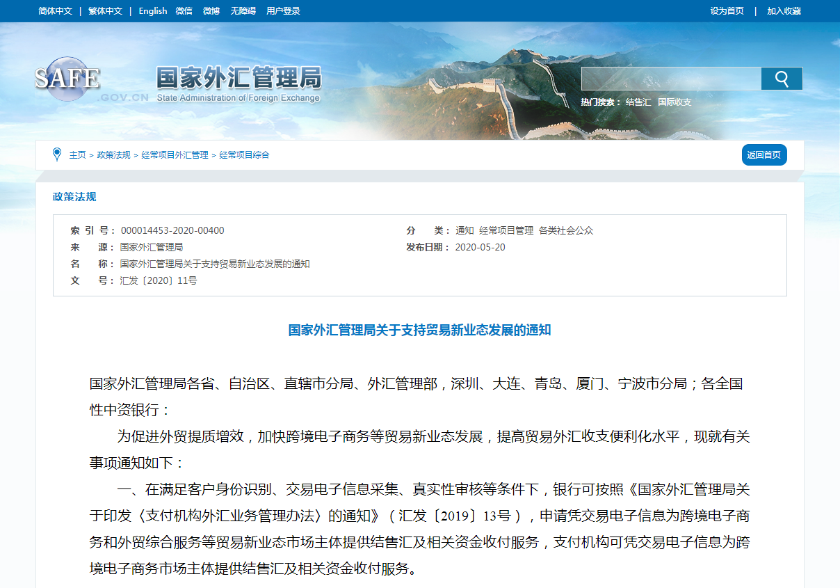發(fā)布《關(guān)于支持貿(mào)易新業(yè)態(tài)發(fā)展的通知》(匯發(fā)〔2020〕11號,以下簡稱《通知》),優(yōu)化了貿(mào)易新業(yè)態(tài)外匯結(jié)算模式,擴(kuò)大賬戶收支范圍,推動更多業(yè)務(wù)網(wǎng)上辦理,在降低市場主體綜合成本的同時,提升跨境結(jié)算效率。