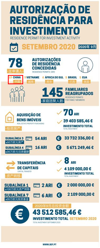 葡萄牙自從推出黃金簽證項(xiàng)目以來一直備受到中國投資者的歡迎。近日,葡萄牙移民局公布了最新黃金簽證數(shù)據(jù):2020年9月共有78位主申請(qǐng)人和145位附屬申請(qǐng)人獲批葡萄牙黃金簽證,投資額為4351萬歐元。