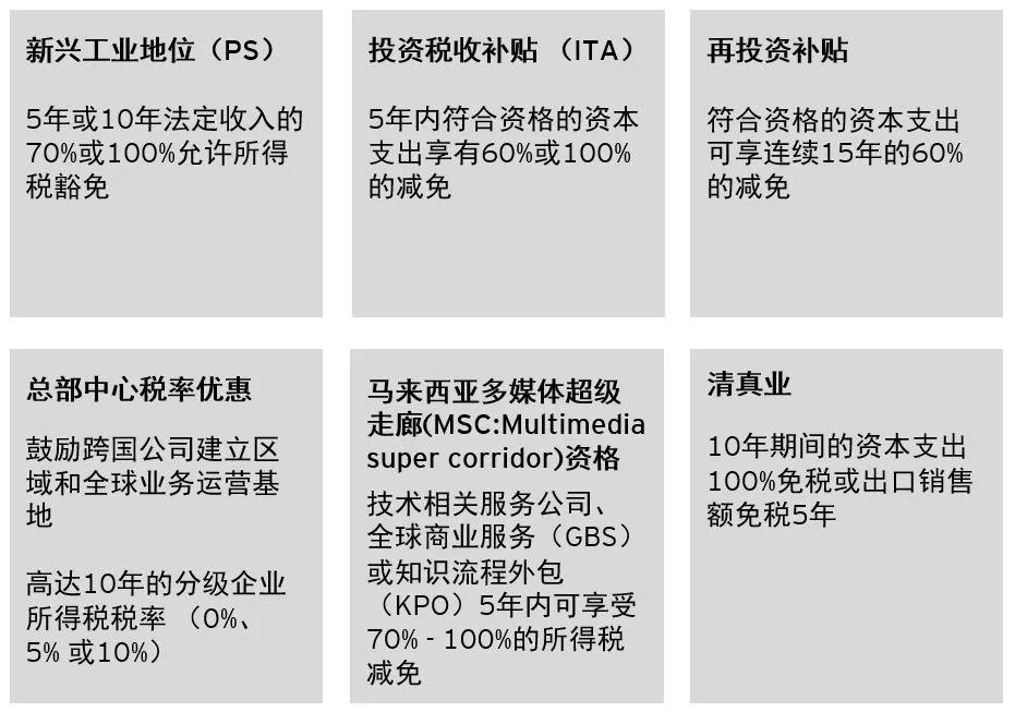 投資稅賦減免(ITA):企業(yè)合格資本支出可享有5年100%的抵扣。該抵扣可全額抵消企業(yè)每課稅年度的法定收入。