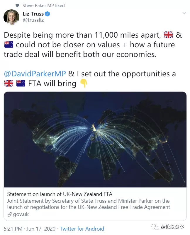 國際貿(mào)易大臣Liz Truss也在個人推特上發(fā)布了談判最新動態(tài)。