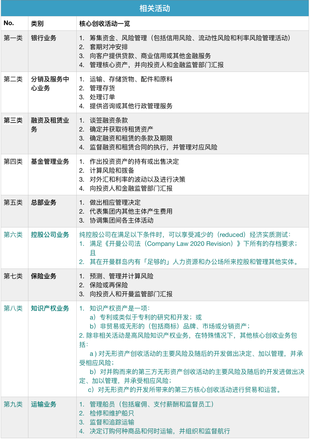 “相關活動”包括九個類別:控股公司業(yè)務、總部業(yè)務、基金管理業(yè)務、融資和租賃業(yè)務、知識產權業(yè)務、船運業(yè)務、分銷和服務中心業(yè)務、銀行業(yè)務、保險業(yè)務。