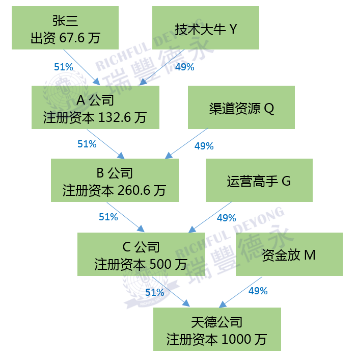 通過(guò)如上金字塔結(jié)構(gòu),我們可以發(fā)現(xiàn)實(shí)際控制人張三通過(guò)4級(jí)控制層、1個(gè)控制鏈條,以區(qū)區(qū)67.6萬(wàn)的出資額,即控制了天德公司1000萬(wàn)資金的使用和實(shí)體公司運(yùn)營(yíng)。