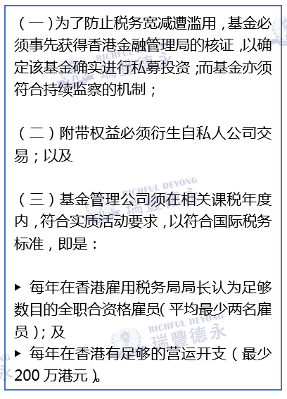 目前為了進(jìn)一步香港鞏固香港私募基金樞紐的優(yōu)勢(shì),特區(qū)政府立法會(huì)將實(shí)施當(dāng)初承諾的第二步驟:為在香港營(yíng)運(yùn)的私募基金所分發(fā)的「附帶權(quán)益」提供稅務(wù)寬減。但有關(guān)附帶權(quán)益必須符合若干條件,方可獲得稅務(wù)寬減,其中包括: