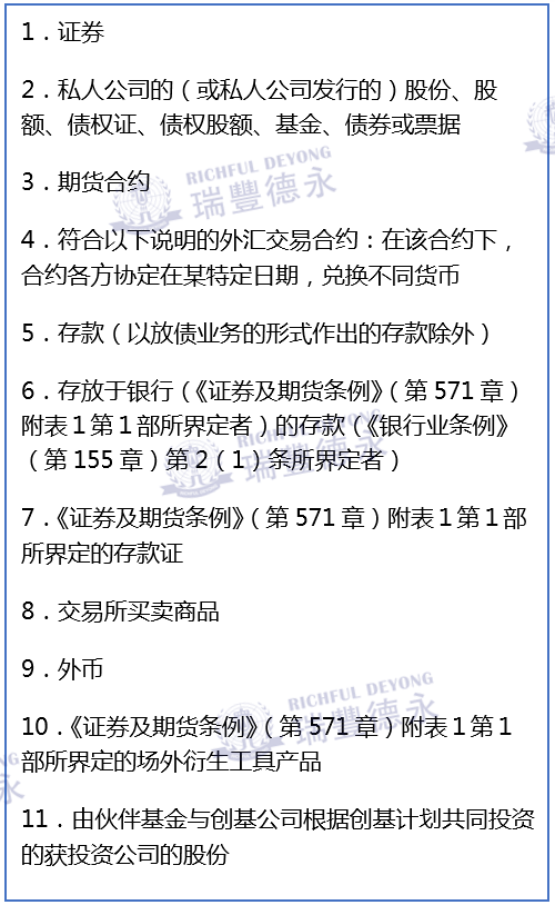 除了建議為附帶權(quán)益提供稅務(wù)寬減外,財(cái)經(jīng)事務(wù)及庫(kù)務(wù)局局長(zhǎng)表示,此次立法也會(huì)對(duì)以私人形式發(fā)售的基金的利得稅制度作出若干改善,以利便基金在香港營(yíng)運(yùn),包括容許基金持有的特定目的實(shí)體,可持有和管理《稅務(wù)條例》(112章)-附表16C指明的類別的資產(chǎn),具體指: