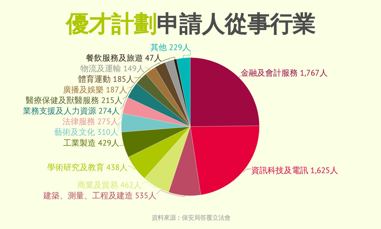 從行業(yè)細分來看,“金融及會計服務”獲分配名額最多,有1767人,其次是“資訊科技及電訊”,有1625人。這兩個行業(yè)人數(shù)占比達48%?!敖ㄖ?、測量、工程及建造”有535人,“商業(yè)及貿(mào)易”、“學術研究及教育”、“工業(yè)制造”,分別有462人、438人、429人。