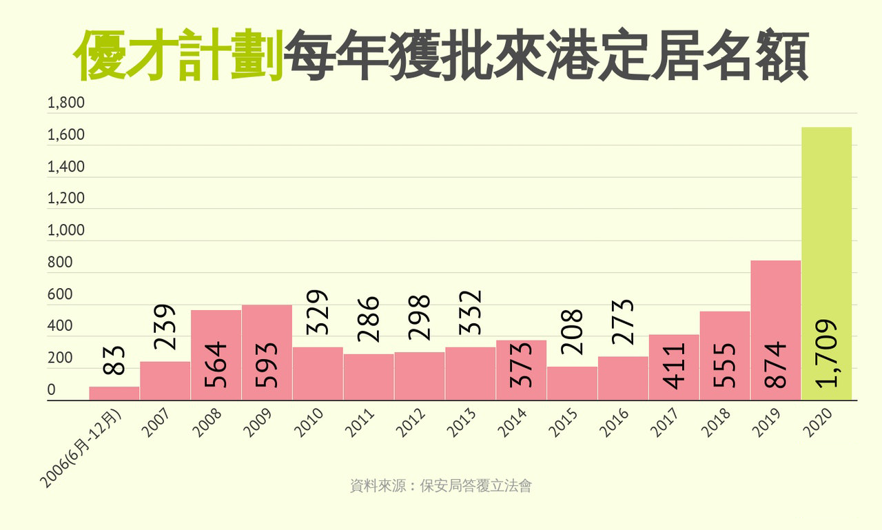 2021年1月6日,香港特區(qū)政府保安局局長李家超表示,在香港優(yōu)才計劃下,2020年有1709人獲批來港定居,相比2019年的874人激增96%,屬推出14年來的新高。
