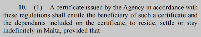 法案中明確提到身份局簽發(fā)的身份紙可以讓申請人及其附屬申請人無限期地在馬耳他居住、定居及生活。身份局通過法案的形式進一步明確了馬耳他身份的永居屬性。