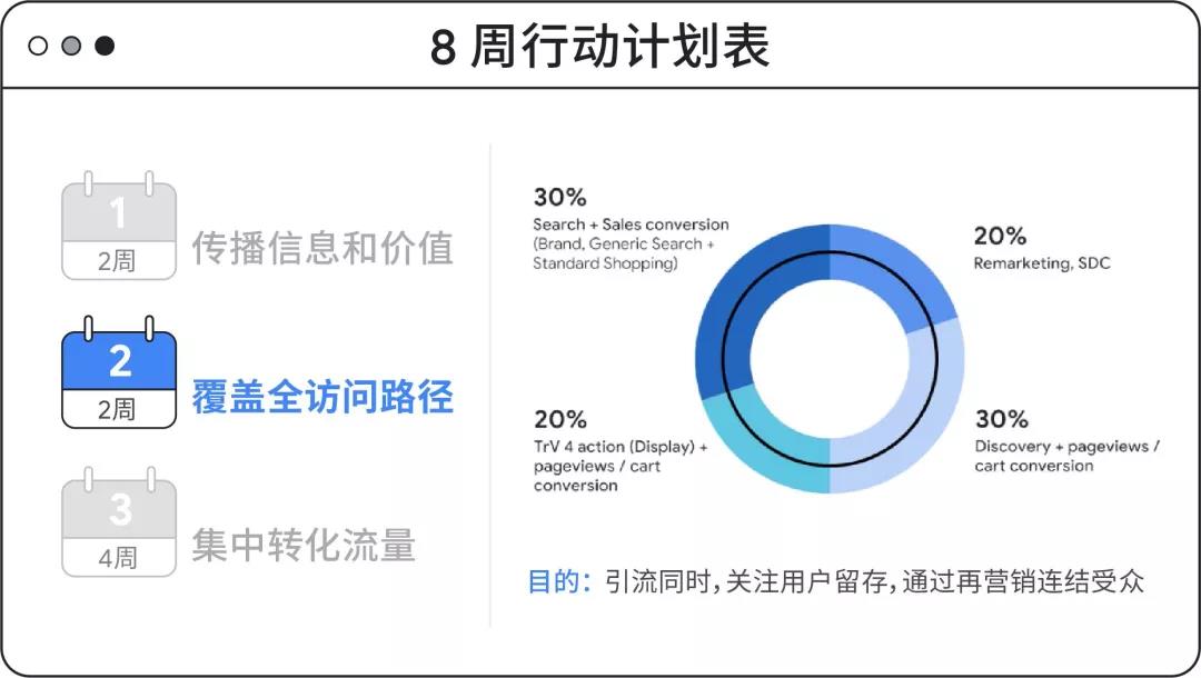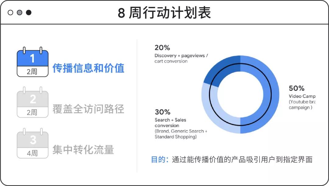 下面我們手把手來教你做一個 8 周的快速啟動行動計劃,你可以參考這個計劃來規(guī)劃自己的節(jié)奏。8 周是一個很基本的周期,總結而言是 2 -2 -4 ,傳播價值- 覆蓋訪問路徑-集中轉化流量這么一個節(jié)奏。