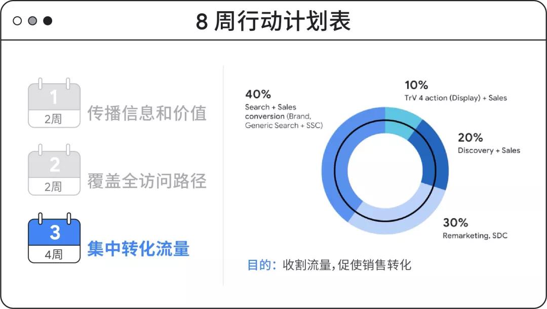 這個周期要把用戶沉淀下來,收集再營銷列表重新把用戶拉回來并保持一定比例品牌傳播的預算