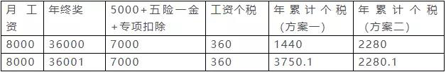 年終獎(jiǎng)36000元,選擇方案一更劃算。但如果年終獎(jiǎng)再多發(fā)1元,方案二比方案一更省錢。
