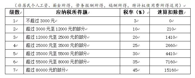 2.非居民個(gè)人取得工資、薪金所得;勞務(wù)報(bào)酬所得;稿酬所得和特許權(quán)使用費(fèi)所得,依照本表按月?lián)Q算后計(jì)算應(yīng)納稅額。