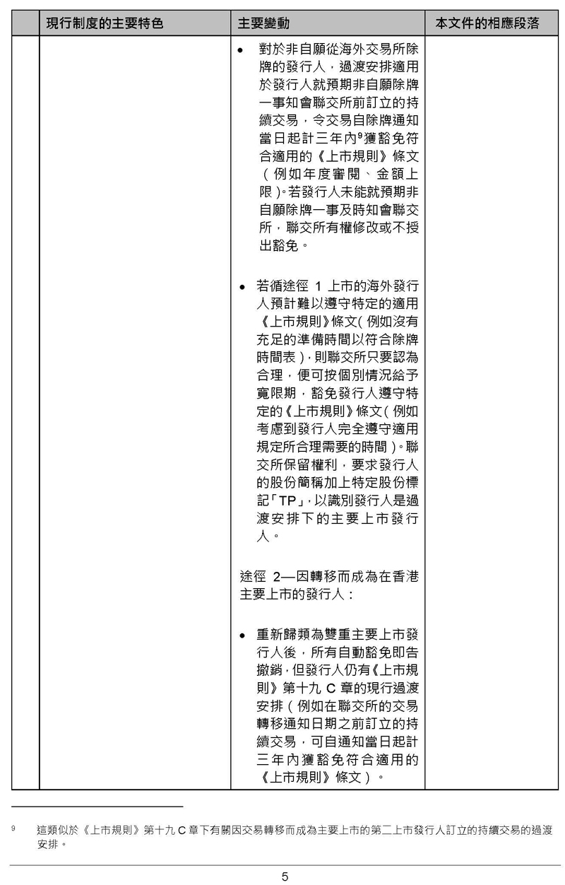 咨詢總結(jié)文件顯示,海外交易所除牌公司,可獲12個月寬限期轉(zhuǎn)用《香港財務(wù)報告準則》或《國際財務(wù)報告準則》編寫財務(wù)報表,三年年內(nèi)豁免符合適用的《上市規(guī)則》條文(例如年度審閱、金額上限),而港交所會保留權(quán)利,要求發(fā)行人股份簡稱加上標記「TP」。