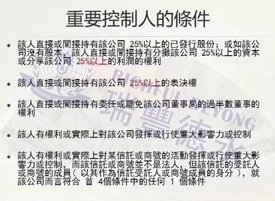這里需要重點關注一下“公司指定代表”的幾個重要條件,現(xiàn)在市場很多小的香港公司注冊中介和代理可能無法達到上述要求,因此在辦理“備存重要控制人登記冊”的時候,一定要找符合條件和資質的機構來做,否則可能出現(xiàn)錢花了事情未辦妥的情況。