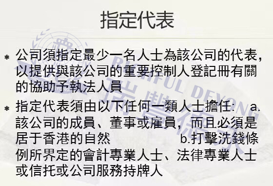 3.最少一名指定代表的姓名或名稱及聯(lián)絡資料,以提供與該公司的登記冊有關的協(xié)助予執(zhí)法人員。公司的指定代表須由以下任何一類人士擔任:該公司的股東、董事或雇員,而且必須是居于香港的自然人;或會計專業(yè)人士、法律專業(yè)人士、信托或公司服務持牌人。