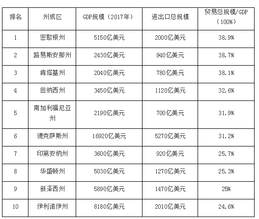 從百分比來看,密歇根州最為依賴國際貿(mào)易,其對外貿(mào)易規(guī)模在GDP中的占比達(dá)到了38.9%。