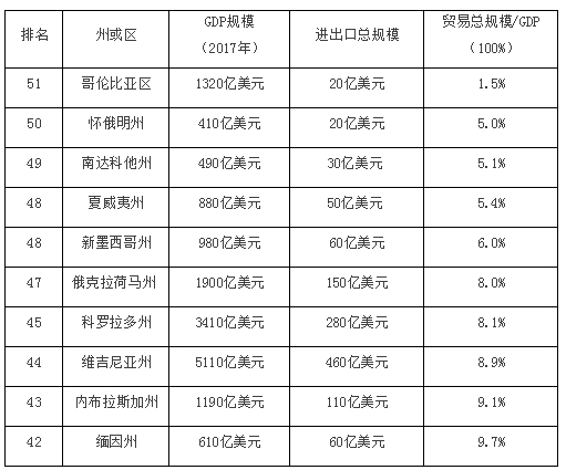 如圖所示,華盛頓哥倫比亞特區(qū)風(fēng)險(xiǎn)最小,其對外貿(mào)易規(guī)模在GDP中的占比為1.5%。