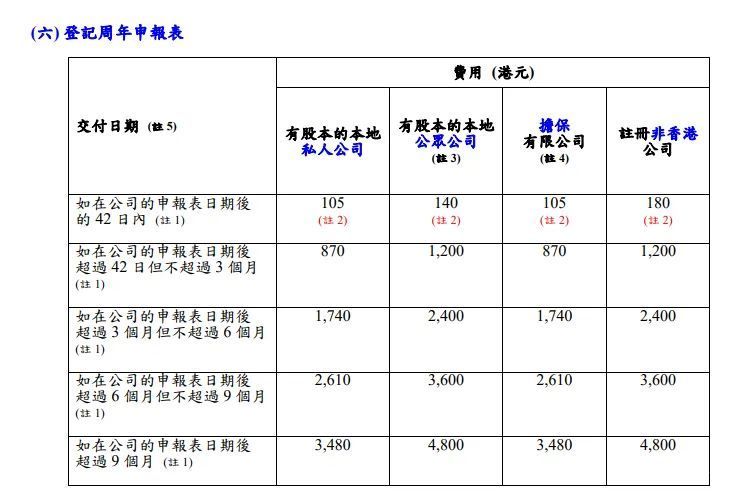6.不年審的后果主要有兩方面,一方面是會產(chǎn)生罰款,商業(yè)登記證更新的罰款是300港元每年,寬限期是30天,周年申報表的罰款是870港幣每個季度,可參照下圖。如果持續(xù)欠費會收到法院傳票,如果還是拒絕上庭與處理將會面臨更多的罰款以及公司強制被除冊,留下不良記錄,對以后再次擔(dān)任公司股東董事還有銀行開戶以及香港出入境都會有影響。