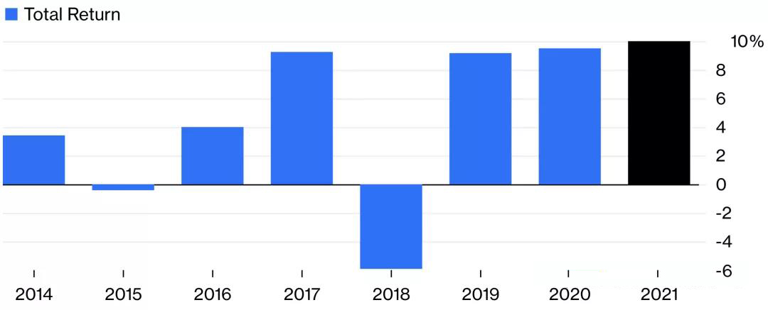 根據(jù)彭博的一份統(tǒng)計(jì)顯示,對沖基金連續(xù)三年上漲超過9% ,2021年10.3%的收益率是自2014年以來最高的。