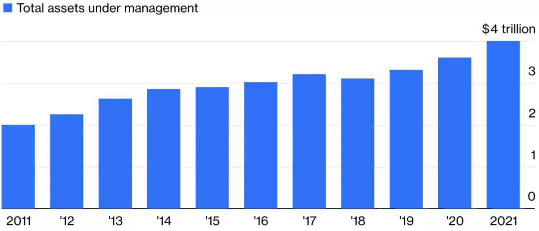 根據(jù)HRF的統(tǒng)計(jì),對沖基金的資產(chǎn)規(guī)模在2018年出現(xiàn)下滑后,到去年12月底攀升至創(chuàng)紀(jì)錄的4萬億美元規(guī)模。2021年增加了4000億美元,是十年前的兩倍。